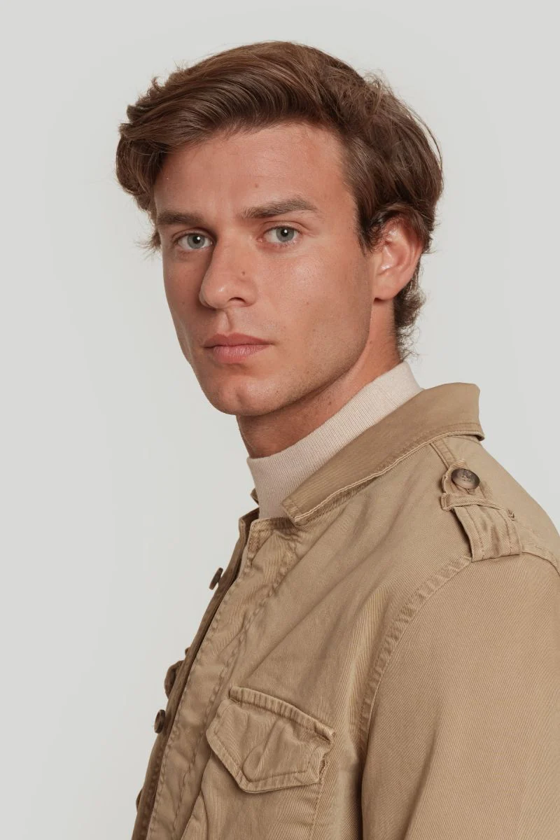 Sahariana con cuello y solapas en los hombros.